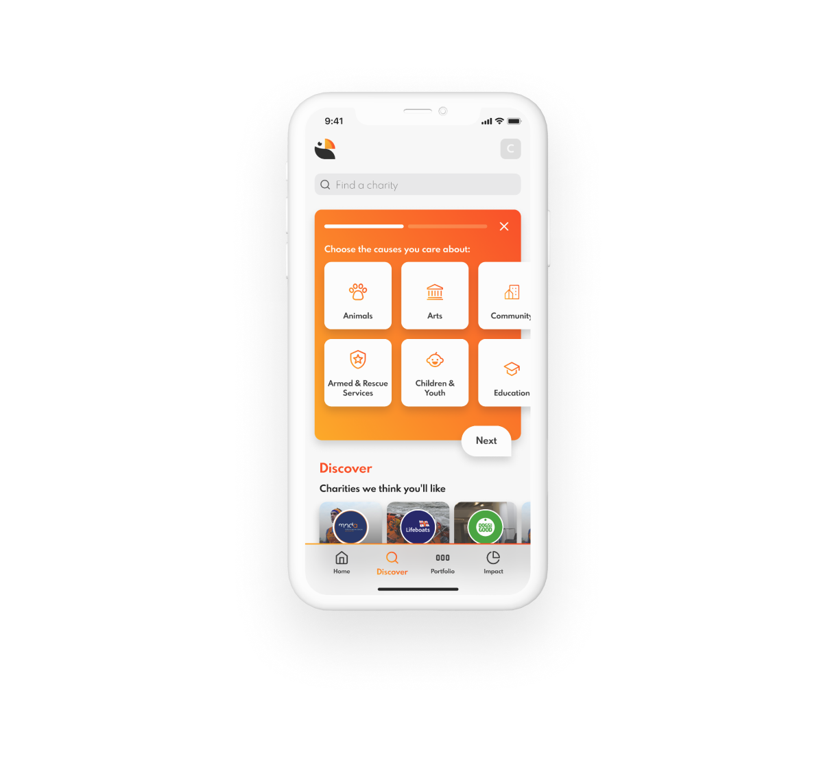 Favourite a charity from anywhere in the app. Then when you're ready, move it from favourites to your portfolio.